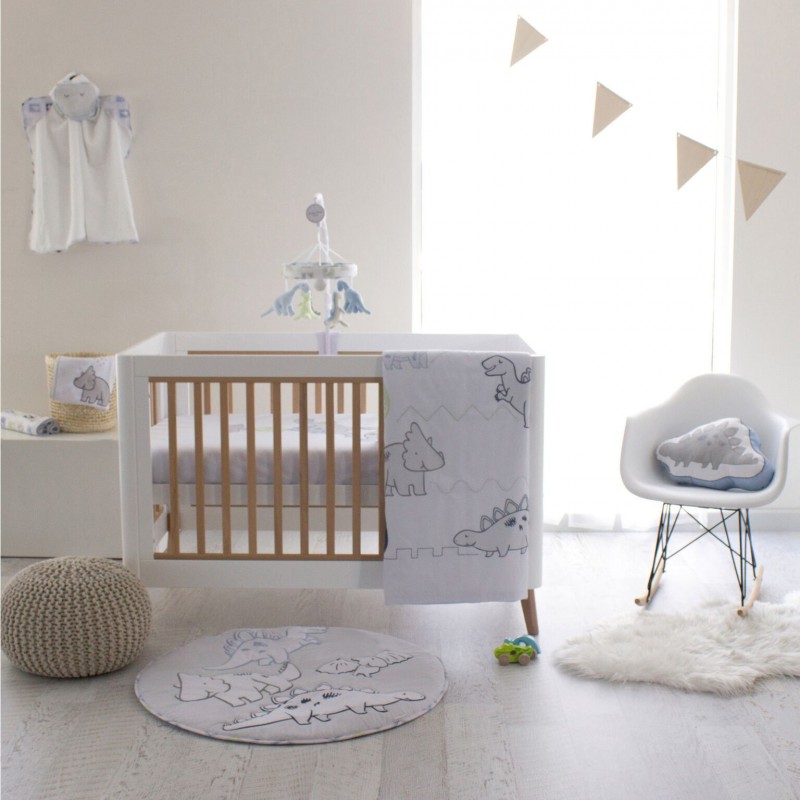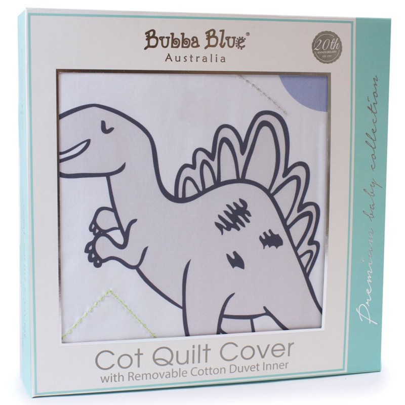 This Bubba Blue Jurassic Cot Quilt is a crisp white cotton percale cot quilt cover featuring friendly and 'not-so-scary' Dinosaurs print/applique on the front with matching print with shades of blue and grey on the reverse side.